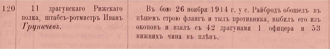 Георгиевское посмертно ГРУНИЧЕВ Иван Андреевич, ротм., 11-й драг. Рижский п., ГО— ВП от 10.11.1915. Убит 15.01.1915 г. Ф.400. Оп.9. Д.35228. Л.1262-1263 (1914); Оп.12. Д.26973. Л.637-643 (1915); Оп.17. Д.24910 (1915). Описание подвига
