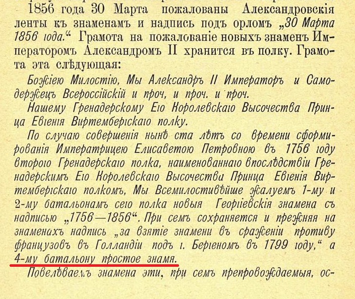 Уважаемый Алексей Витальевич! Большое спасибо за Ваше замечание. Интересно, что на пожалование 4-му батальону Георгиевского знамени указывают дополнение к Историческому описанию и Звегинцов (ему простительно в силу доступных ему материалов). К сожалению, посмотреть текст Высочайшего приказа от 30.03.1856 не удалось ввиду отсутствия приказа на эту дату в сборнике Выс приказов на сайте РГБ