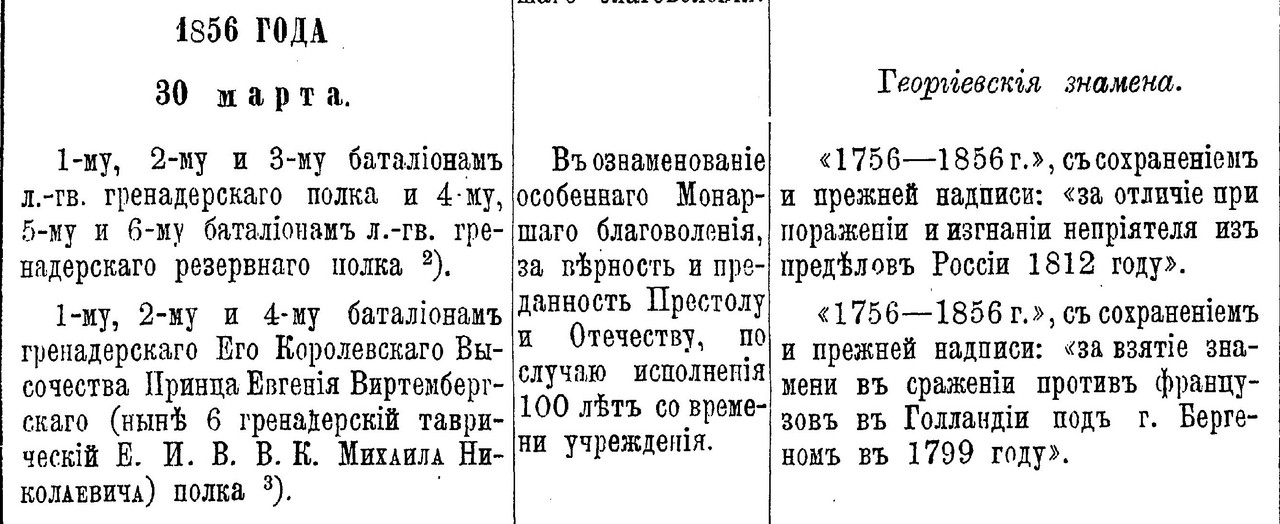 alex960: "6-й гренадерский Таврический Его Императорского Высочества Великого Князя Михаила Николаевича полк 1-го и 2-го батальонов Георгиевские с Александровскими лентами и надписями: «За взятiе знамени въ сраженiи противъ Французовъ въ Голландiи подъ г. Бергеномъ въ 1799 году» и «1756 – 1856» 3-го батальона простое 4-го батальона простое (судя по надписи на скобе согласно Расписанию 1884 г.) При этом 4-му батальону 30.03.1856 пожаловано ГЗ с надписями: «За взятiе знамени въ сраженiи противъ Французовъ въ Голландiи подъ г. Бергеномъ въ 1799 году» и «1756 – 1856» и, вероятно, с Александровской лентой Вопрос. Какое знамя было выдано 4-му батальону в 1879 г.?" --- У Богдановича и Габаева маленькая неточность:
